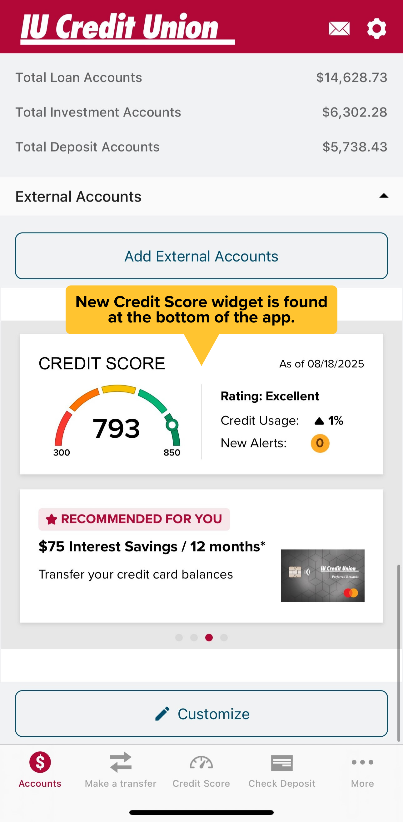 Easily keep an eye on your credit health with the NEW Credit Score widget. View your score right from your mobile banking dashboard.
