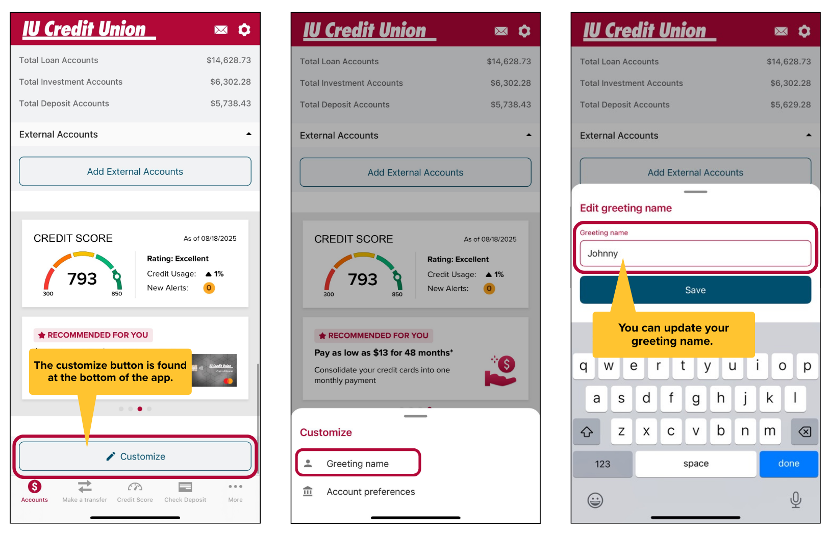 Your mobile banking experience is getting a small but handy update! You’ll now see a ‘Customize’ button that lets you change your greeting name and your Account Preferences, giving your app a personal touch.